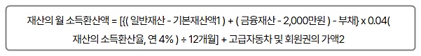 | 재산의 소득환산액 | ![]() 지역별 기본재산액은 대도시는 1억 3,500만원, 중소도시는 8,500만원, 농어촌은 7,250만원 공제됩니다. (자세한 내용은 왼쪽 링크로 확인할 수 있어요) |
